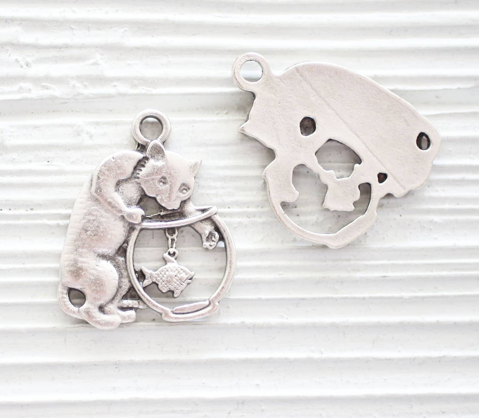 Cat catching fish pendant, cat pendant silver, animal pendant, kitten pendant, cozy cat charm for necklaces, silver cat