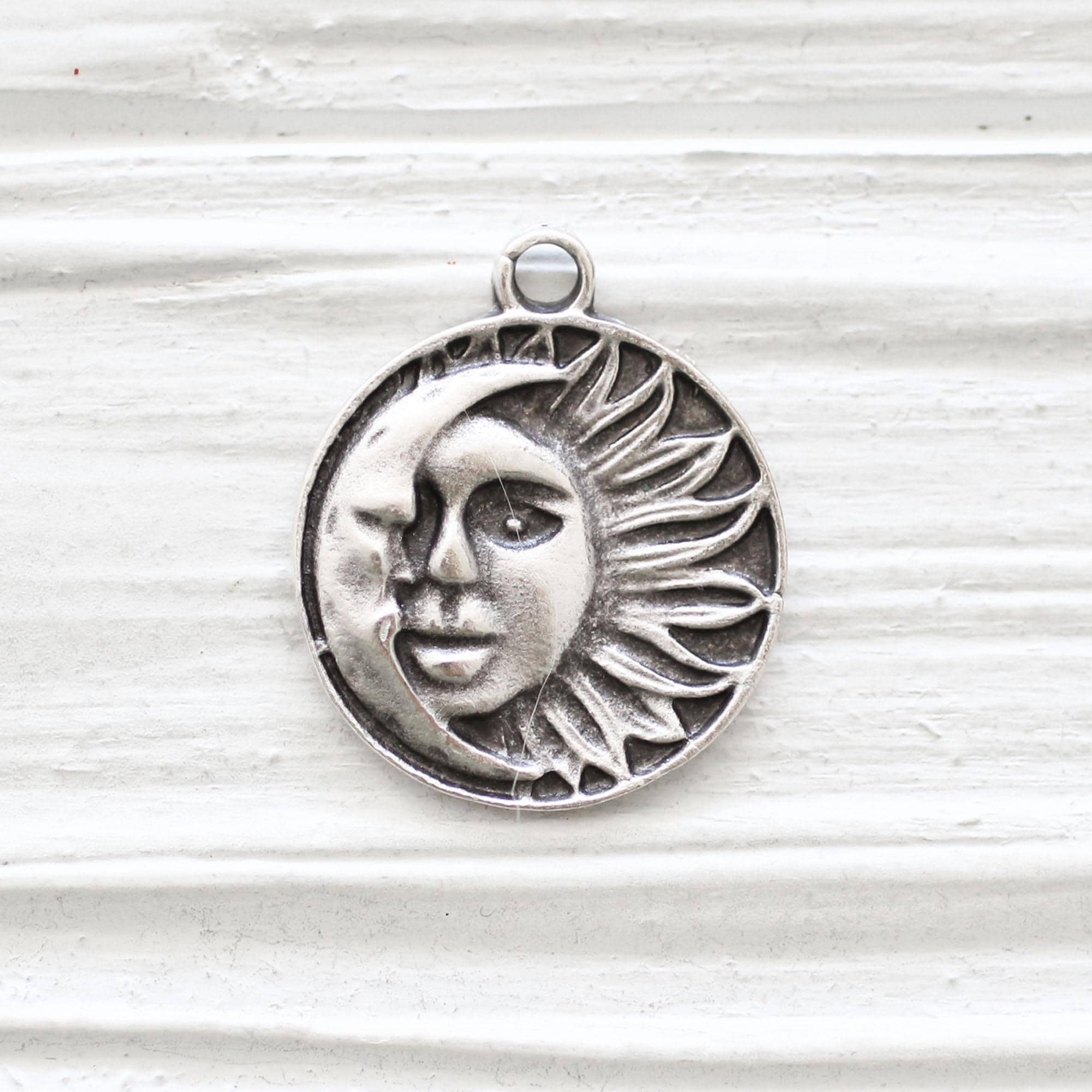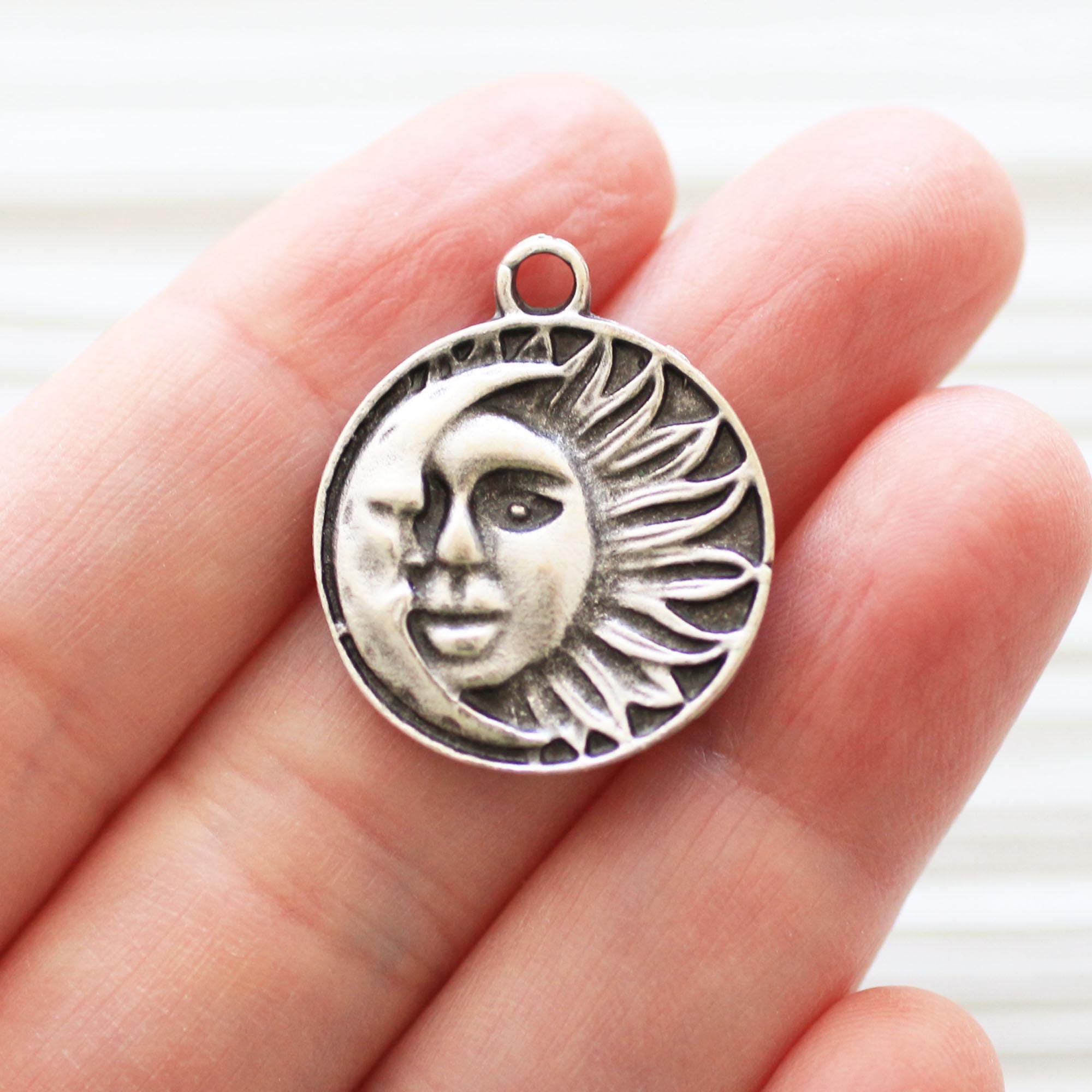 Silver Sun Moon Pendant, Tribal Boho Findings, Ornate Rustic Charm (23mm)